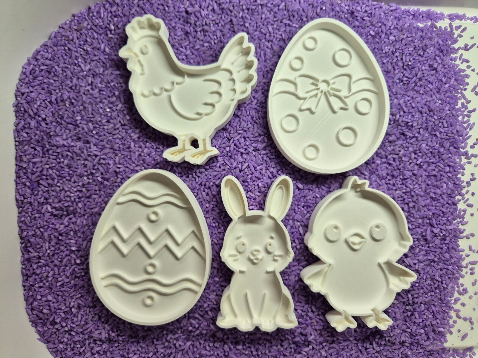Deze vorm is onderdeel van een set. De set bestaat uit vijf verschillende vormen die perfect passen bij het Paasthema: twee paaseieren met verschillende patronen, een paashaas, een kuiken en een kip. Door de verschillende figuren ontstaan er steeds weer nieuwe speelmogelijkheden.